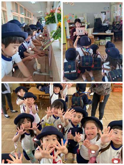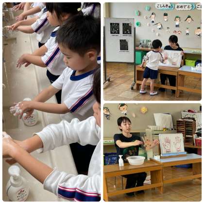 手洗い 公開日 2024/04/23 更新日 2024/04/23 保健指導 学期初めの保健指導は、感染症対策の基本である「手洗い」について話をしました。園生活では、外から帰った後、遊んだ後、トイレの後や食事の前など様々な場面で手を洗います!手洗いソングを歌って、楽しみながら手を洗いましょう(^^)/ いいね(0)