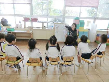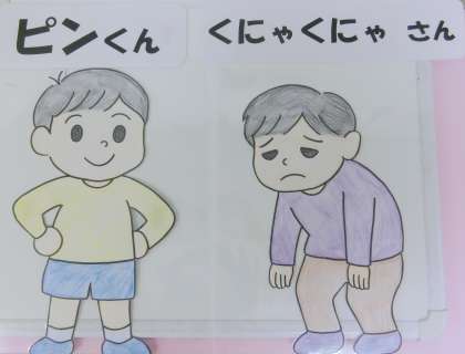 3歳児に「素敵な姿勢」について保健指導を行いました。ピンくんとくにゃくにゃさんを見比べ、どんな立ち方・座り方が良いかみんなで考えました。実際にピンくんのような姿勢をまねしながら、楽しく姿勢づくりに取り組みました。