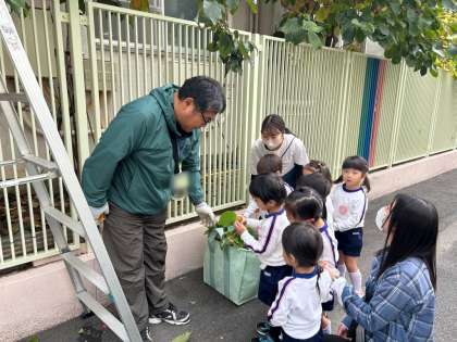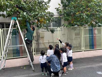 今年は幼稚園の柿が大豊作! 収穫するところを3歳児が見学です^_^