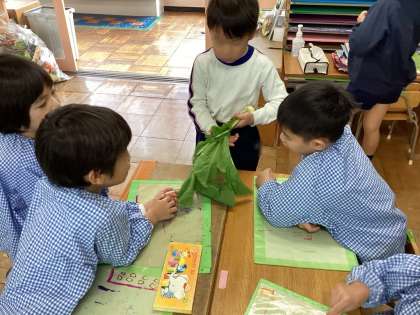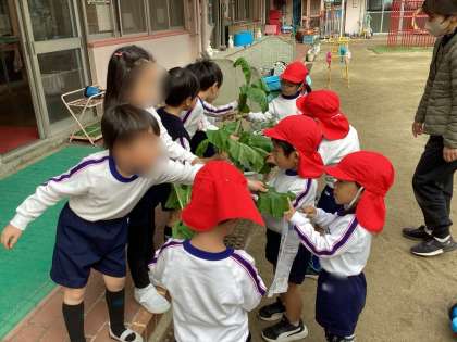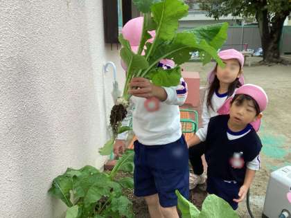 「うんとこしょ」「どっこいしょ」と4歳児が収穫し、3歳児や5歳児にお知らせしました!