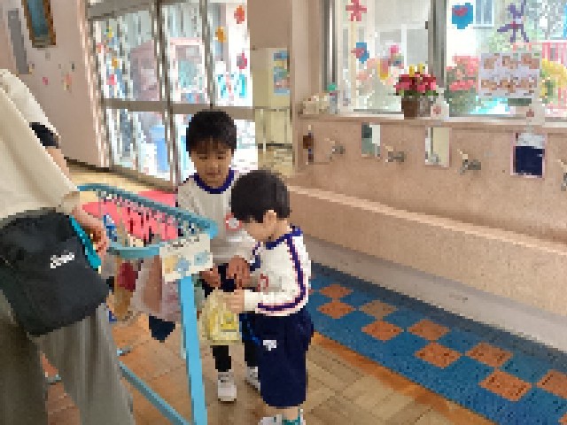 新入園児のお友達も、少しずつ幼稚園の生活に慣れてきました。3歳児が朝や帰りの用意をするときに、5歳児がお部屋に来て手伝ってくれています。そんな5歳児の姿を見た4歳児も、お手伝いをしてくれていました。幼稚園のお兄さんやお姉さんとの関わりが、幼稚園で安心して過ごすことにつながっています。