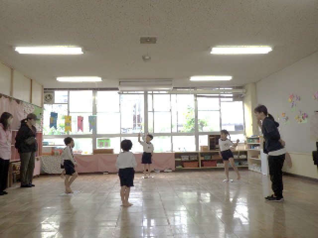3歳児は、朝登園してから朝の身支度を自分なりに頑張っている様子、好きな遊びを見つけて楽しく遊ぶ様子を見ていただき、最後はさくら組やお家の方と一緒に歩いたり、ジャンプしたりして、体を動かして楽しみました♪