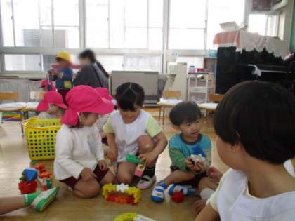 4歳児のクラスにも遊びに来てくれる3歳児の友達。初めての年下の友達に困ってしまう姿もありましたが、優しく手を差し伸べたり、受け入れてくれたりする優しさが見られるようになりました。
