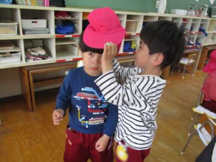 5歳児の子どもたちは一番大きい組になりました。年下の友達の朝や帰りの用意をお手伝いに行きました。はじめはどのように手伝ったらいいのか戸惑う姿もありましたが、次第に目線を合わせ、寄り添う思いやりの心が育まれていきました。