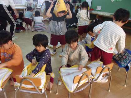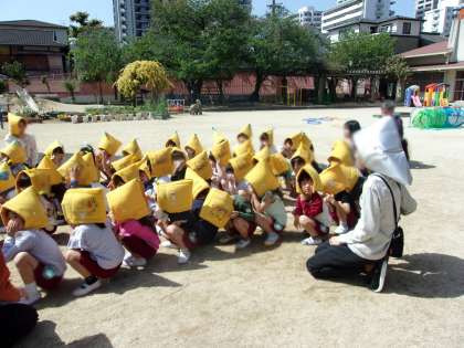 4.5歳児の子どもたちは先生の話をよく聞いて、先生の近くに集まったり、頭を守る態勢とったりして、自分で一生懸命取り組む姿がありました。その後、防災頭巾を被って園庭に避難しました。