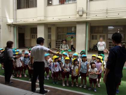 4.5歳児の子どもたちは、幼稚園周辺にある学校へ散歩に行きました。