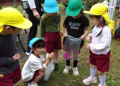 高校では、中庭を探検。タンポポやタンポポの綿毛、ツツジの花などを見つけたり、池の中のメダカを見たりと春の自然に触れて遊びました。