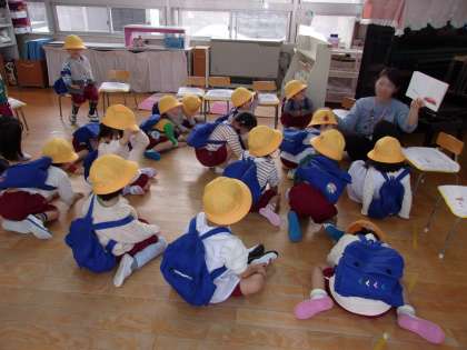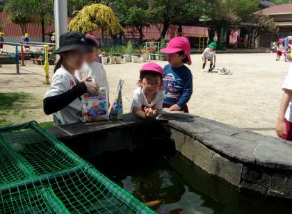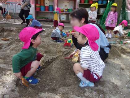 砂場で先生と一緒に山をつくったり、先生のためにご飯をつくったり、先生と一緒に金魚やカメにご飯をあげたり…