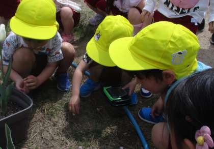 保育室の前でダンゴムシを飼育しています。登園してくると友達だけではなくダンゴムシに挨拶したり、水シュッシュしたりと進んで世話をしています。また、園庭に出るとダンゴムシ探しに行ったり、別の遊びをしていてもダンゴムシを発見して連れてきたり…ダンゴムシと共に過ごしています。生き物のパワーは凄いです。幼稚園生活への期待へとつながると同時に、共通のイメージをもつことで驚いたり、喜んだりして気持ちを共有するきっかけになっています。