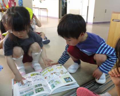 動かなくなったダンゴムシに気付き、どうしたら元気でいることができるのかを自分なりに考えたり、皆で絵本や図鑑を見て調べたりしました。好奇心や探究心も育まれています。