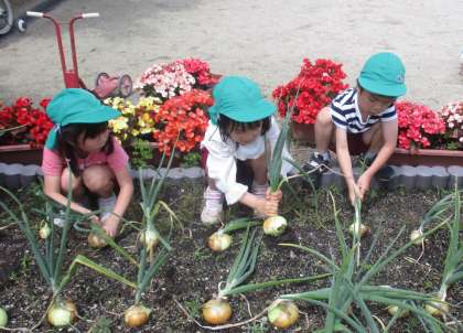 スーパーで見る野菜と異なり、つるになっているスナップエンドウや土から顔を出しているタマネギの様子に興味津々の子どもたち。収穫を迎え、大喜びでした。
