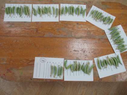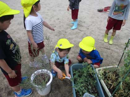 収穫した後、豆の詰まっている様子やタマネギの根の長さなど様々な発見をしていました。大きさの違いに気付いた子どもたちの姿から、大きさ別に並べてみたり、数を数えてみたりしました。このような経験の中で、数量や図形に触れ、体験として子どもたちの中に育まれていくのでしょう。【遊びの中で学ぶ】