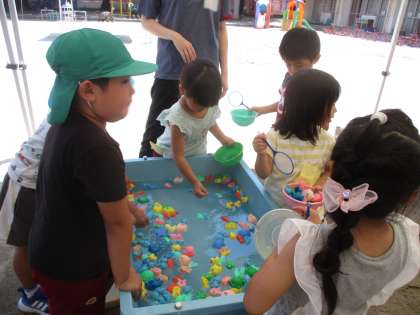 水遊びのスーパーボールすくいや金魚すくい、ヨーヨーつりなど、夏の遊びや5歳児が考えた遊びを回って遊ぶおまつりごっこ。