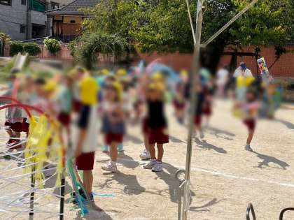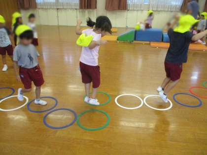 暑い日が続く中、遊戯室で遊ぼうと体を動かすことへも前向きな子どもたち。一本橋や巧技台ジャンプなど、自分なりに挑戦したり、リズムに合わせて体を動かしたりして全身をつかって遊んでいます。その中で、生活経験から遊戯室を公園や遊園地、動物園などというイメージをもち、友達と共有しながら遊んでいます。