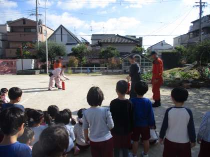 天王寺消防署の方に火災の避難訓練の子どもたちの様子を見ていただき、教職員の消火訓練をさせていただきました。子どもたちは非常ベルを聞いて、速やかに避難することができました。