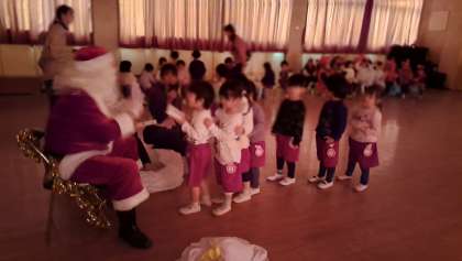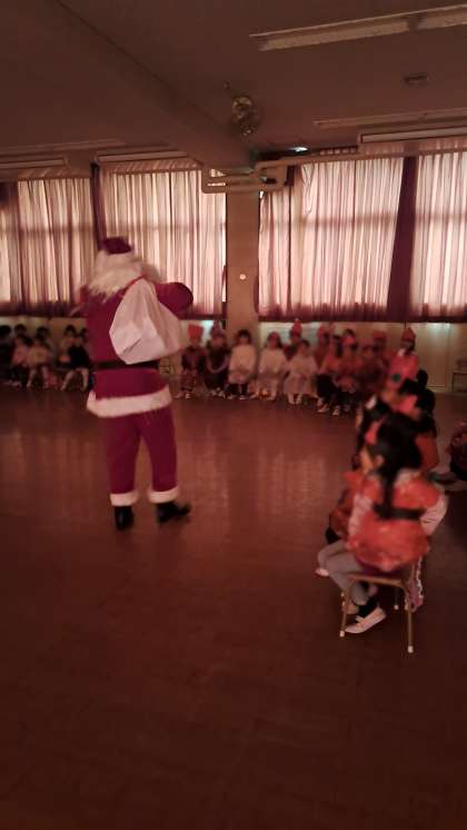 幼稚園にサンタクロースが来てくれました。子どもたちは鈴の音や煙突から落ちた音に胸を高鳴らせ、目が輝いていました。質問をしたり、歌を聞いてもらったりしました。最後手渡しでプレゼントをもらう時には少し緊張している様子もありました。