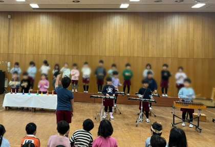 3歳児4歳児の頃に経験してきた打楽器に加え、大太鼓やシンバル、音階のあるボックスホーンや鉄琴、ハンドベルにも挑戦しています。友達とリズムを合わせたり、音階を感じたりしています。