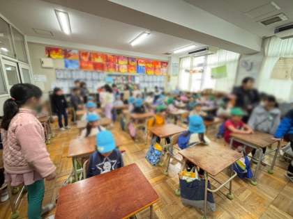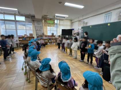 今回は桃陽小学校へ交流に行きました。1年生は椅子を並べて待ってくれており、小学校の紹介の作文を読んで教えてくれました。また、じゃんけん列車をしてふれあって遊ぶ機会もあり、お兄さんお姉さんへの親しみの気持ちをもつことができようです。校内探検では、図書室で司書さんから絵本の読み聞かせをしてもらったり、教室にお邪魔して椅子に座らせてもらったりして小学校への憧れや期待の気持ちがふくらんでいました。快く受け入れてくださった4年生の教室では、ビー玉転がしを見せてもらったり、遊ばせてもらったりして大きいお兄さん、お姉さんとの関わりももたせてもらいました。