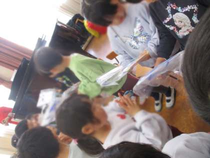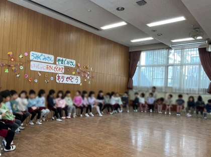 あっという間に5歳児うみ組やま組の修了式が迫っています。その中で3.4歳児の子どもたちと教職員でお別れ会をひらきました。