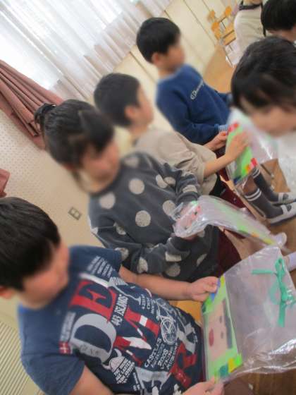 4歳児は運動会をはじめ、合奏などを見てきて、憧れの気持ちがとても大きくなっており、プレゼントつくりでは、うみ組やま組一人一人の顔を思い浮かべながらつくり、渡した時の笑顔を見て喜んでいました。そして、お返しに引き継ぎとしてもらったリレーのバトンとパラバルーンを前に、表情が引き締まり、自信に満ち溢れていました。