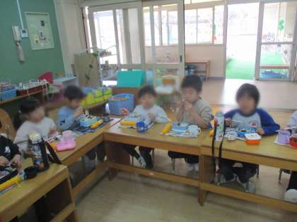 お別れ会後も園庭で一緒に遊んだり、弁当を誘い合って好きな保育室に行って食べたりして1日異年齢で関わり合いながら過ごしました。日常的に異年齢で遊び、教職員もクラスを超えてい関わっていることから、どの先生でも安心して過ごしていました。