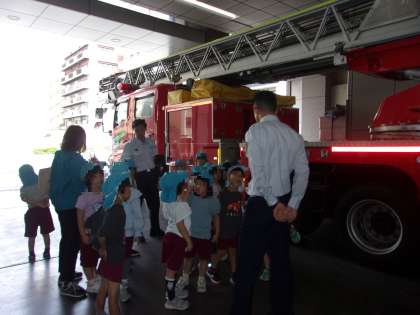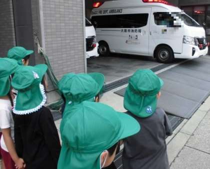 5歳児うみ組やま組が天王寺消防署に園外散歩に出かけました。