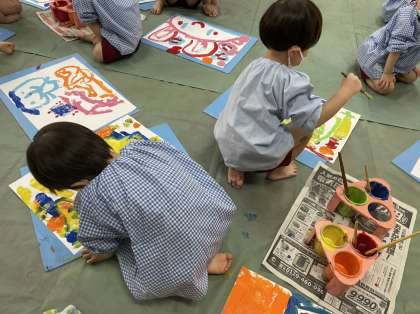 色鮮やかな絵の具をたっぷり筆につけて、のびのびと楽しそうに絵を描いていました。幼稚園で遊んでいる様子をイメージしながら描いていました。