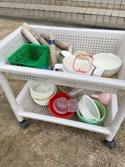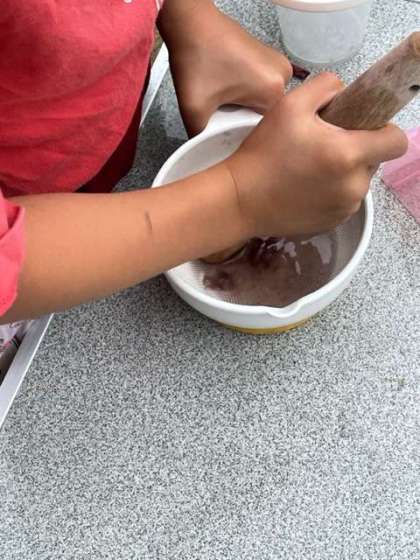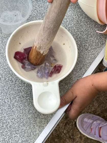 年長組の子どもたちが花びらをすりこぎでゴリゴリ…お水をちょっぴり混ぜてまたゴリゴリしています。水の量を加減しながらすりこぎを握る手に力を入れています。