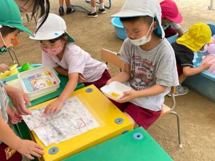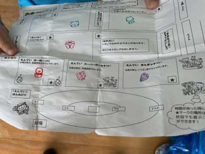 年長組の子どもたちはお店番の仕事をはりきってしています。明日もカードにスタンプを押します。