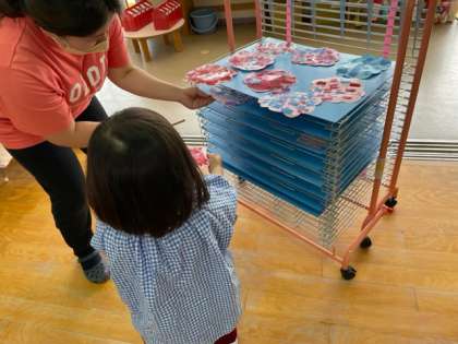 すみれ組のスタンプ遊び、あじさいのお花になりました。そして今日行った6月誕生会の飾りになりました。