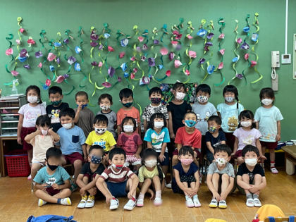 きく組の壁に朝顔が!子どもたちが作った朝顔です。なんて素敵なんでしょう!1学期のあいだ幼稚園でいろいろな経験をしました。夏休みも元気に過ごしてくださいね。
