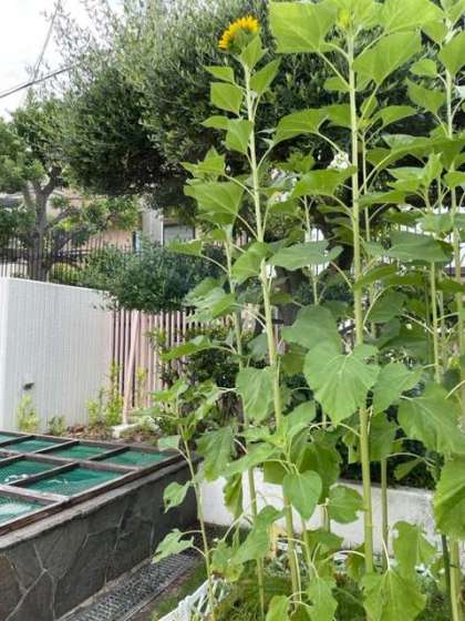 年長組の子どもたちが植えたヒマワリがぐんぐん伸びてこんな高さになりました。大人の背丈よりもずっと高く2メートル近くあります。そして昨日花が咲きました。