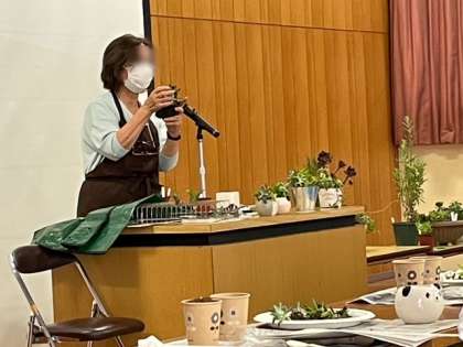 ?本日は、〔五条地域民生委員 グリナリー天王寺元会長 グリーンコーディネーター大阪副会長の田原惠美子様〕をお招きし、「多肉の寄せ植えとその後のメンテナンス」の講座をしていただきました。