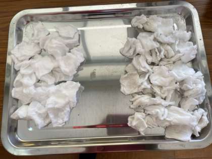 毎月の体重測定のあと養護教諭が保健指導をしています。今月は手洗いについての話でした。子どもたちは静かに話を聞いています。さて、これは何でしょう?右が子どもたちが手を洗った後に手を拭いたカット綿です。あらあらこんなに汚れているんですね。子どもたちもびっくりしていました。(左は使用前のカット綿です)