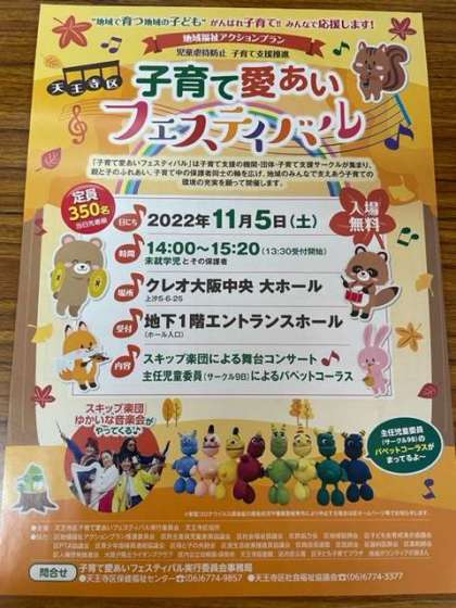 子育て愛あいフェスティバル 公開日 2022/10/20 更新日 2022/10/20 お知らせ 11月5日土曜日クレオ大阪中央にてこのような催し物があるそうです。スキップ楽団のコンサート、とても楽しいと思います。ご興味のある方はぜひご参加ください。 いいね(0)