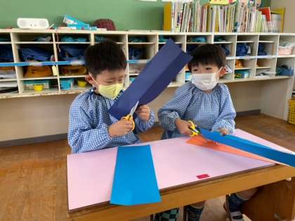 5歳児うみ組では、子どもたちがハサミを使って画用紙を細長く切っていました。自分で画用紙を折り、その線にそって切っています。ガタガタにならずまっすぐ切れるように、真剣に紙を見ながらハサミを扱っています。さてこの細長い紙は何に使われるのでしょうね?楽しみですね。