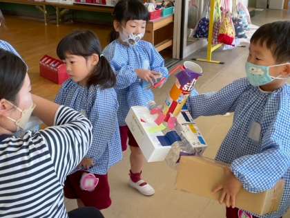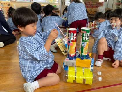3歳児すみれ組では、お家から持ってきていただいたいろいろな物をくっつけて遊んでいます。自分でいろいろ考えながら作るのが、とっても楽しそうです。そして「ねえねえ、みてみて」と先生に見せるのが、これまたとっても嬉しそうです。
