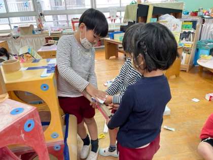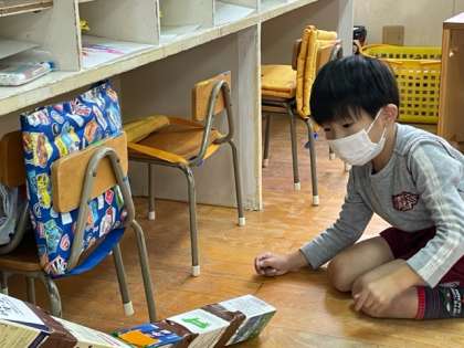 どんぐりコロコロ 公開日 2022/11/14 更新日 2022/11/14 幼稚園の様子 たくさん集まったどんぐりを、いろんな材料を組み合わせて作ったすべり台みたいな所で転がして遊んでいます。友達と相談して試したり作り直したりしています。 いいね(0)