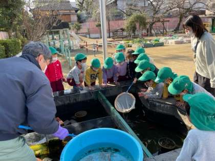 冬本番になってきました。今年次々増えた金魚たち。幼稚園の池に約40匹いますが、寒さが心配です。廊下の水槽に引越しさせることにしました。職員と5歳児の子どもたちとで網ですくっていったんタライに入れました。廊下の水槽に引越しした金魚たちは初めての場所に戸惑っているのか身を寄せ合ってじっとしていました。