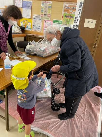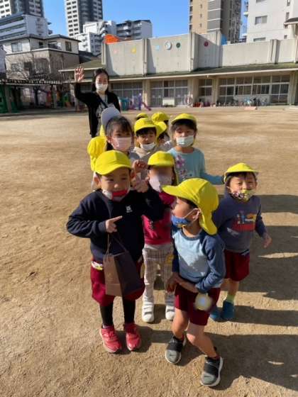 プレゼントをお届けに… 公開日 2022/12/16 更新日 2022/12/16 幼稚園の様子 ?4歳児きく組の子どもたちが桃ケ丘会館へ出かけました。手作りのカードに絵を描いてプレゼントを作ったので、桃ケ丘地域にお住まいのおじいちゃんおばあちゃんたちに渡しました。とっても喜んでいただけたので子どもたちも満足感いっぱいでした。桃ケ丘地域の皆様ありがとうございました。 いいね(0)