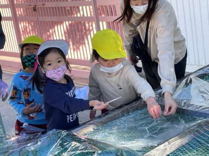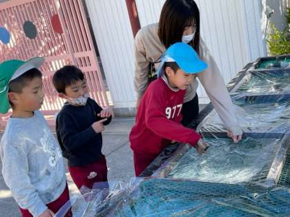 金魚の寒さ対策で池の上にかけていたビニールに溜まった雨水が凍っていました。子どもたちは氷の冷たさ美しさに驚き興奮していました。