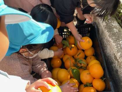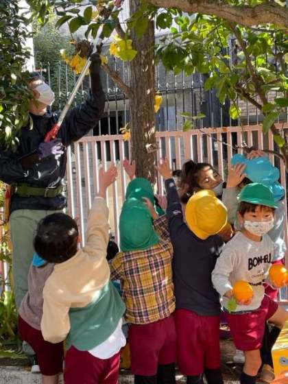 幼稚園のみかんの木に実がつき、少しずつ大きくなってきていました。色鮮やかなみかんの色はよく目立つので、子どもたちは「すごいたくさんある〜」「だんだん大きくなってきてる」「早く食べたいな〜」と毎日見上げて楽しみにしていました。今日はいよいよ収穫することになりました。1人1個ずつ持ち帰ります。