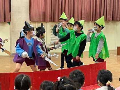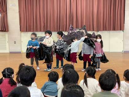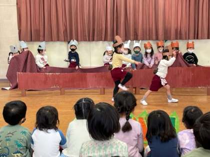 ピーターパンとフック船長の戦いの場面で、見ていた他のクラスの子どもたちから「ピーターパン頑張って〜!」と大きな声援が送られていました。4歳児きく組の劇遊びでは、迫力あふれるコウモリたちが出てきました。