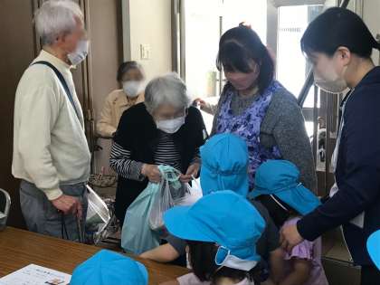 桃丘会館訪問 公開日 2023/05/02 更新日 2023/05/02 幼稚園の様子 桃丘会館の食事サービスに来られる方に折り紙のプレゼントを持って5歳児数人で行きました。手渡しの短い時間ですが、子どもたちの姿に笑顔で応えてくださっていました。子どもたちも地域の方に見守られていることを感じてくれることを願っています。 いいね(0)