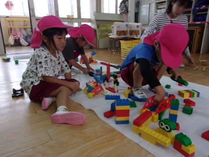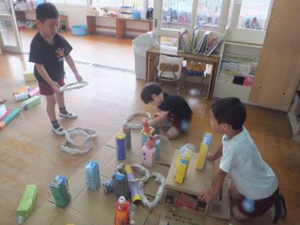 あべのハルカスに行った翌日には、ブロックで建物をつくって並べてみたり、空き箱などを使って建物をつくったりして遊んでいます。5歳児は建物を並べて輪投げの的にしようと遊びが広がっています。