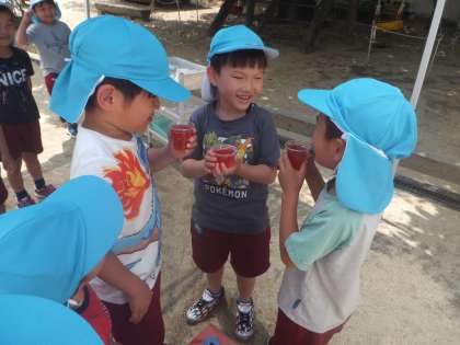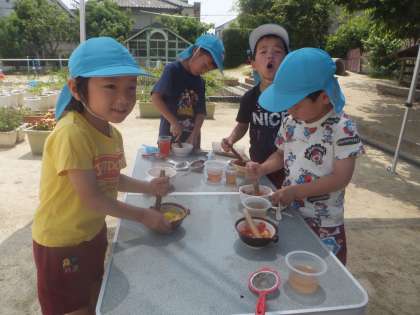 5歳児は、本物のジュースのように透き通った色水にするため、手やすりこぎなどを使って試行錯誤したり、花ごとに色の違いを比べたりして楽しんでいます。ヤマモモの実やビワの実を使うと花びらとは違い、とてもいい香りになることにも気付いていました。