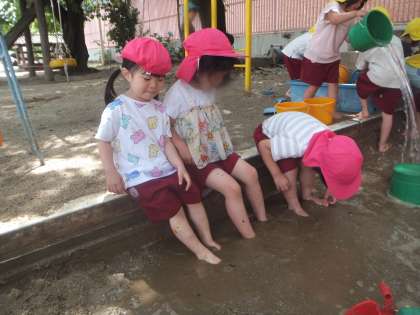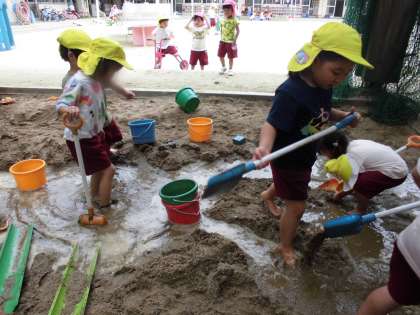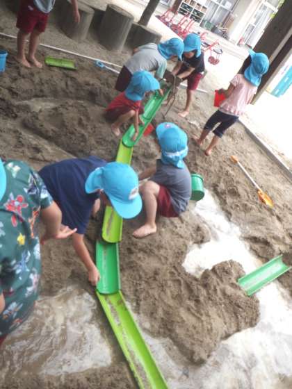 日によっては水が心地よい季節になりました。砂場で泥遊びをしています。迷路のように掘った所に水をどんどんバケツで運んでは流します。あっという間に川や池のようになります。子どもたちはいつもと違う砂や泥の感触を味わったり、水の流れる面白さを感じたりして楽しんでいます。川のように水を流すために、高さを変えたり、水の量を考えたりしている姿も見られています。
