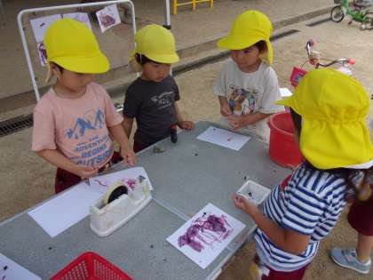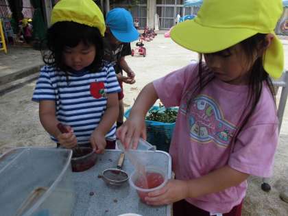 落ちていた実を使って紙に擦って絵をかいて遊びました。また、5歳児のジュース作りを見て、真似て色水作りも始まりました。色の出る面白さや不思議さを感じているようでした。毎日繰り返し遊んでいると、5歳児のように色が鮮やかに出てきたり、本物のジュースのようにつくれたりして、満足感を感じています。