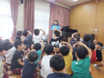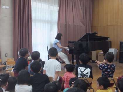 毎月全園児で誕生日をお祝いしています。自己紹介を聞いたり、歌や言葉、手づくりプレゼントを送ったりしています。その中で園長先生からはクラシックのピアノ演奏を聞かせていただいています。本物のコンサートになかなか行くことのない子どもたちへのミニ演奏会です。