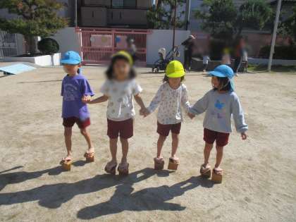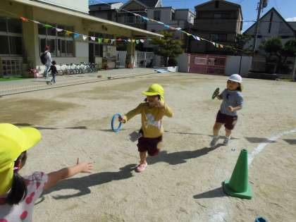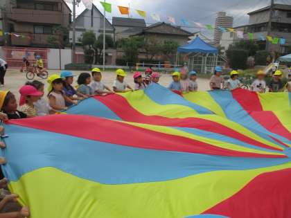 運動会後、担任同士で声をかけあい、互いの遊びをいつでもできるようにしました。すると3.4歳児は5歳児への憧れからリレーやパラバルーンを一緒にしたり、チャレンジしていた縄や下駄、自転車に挑戦したりする姿が見られるようになりました。5歳児は尋ねられたり、頼りにされたりすることに、さらに自信と誇りをもっているような表情や姿へと変わってきています。運動会はあくまでも保育の通過点です。運動遊びを通して、体を動かすことに限らず、憧れや思いやりの気持ちが育まれていることが分かります。この気持ちは日々の頑張りを互いに見たり、聞いたりしてきたことで生まれ、受け継がれていきますね。